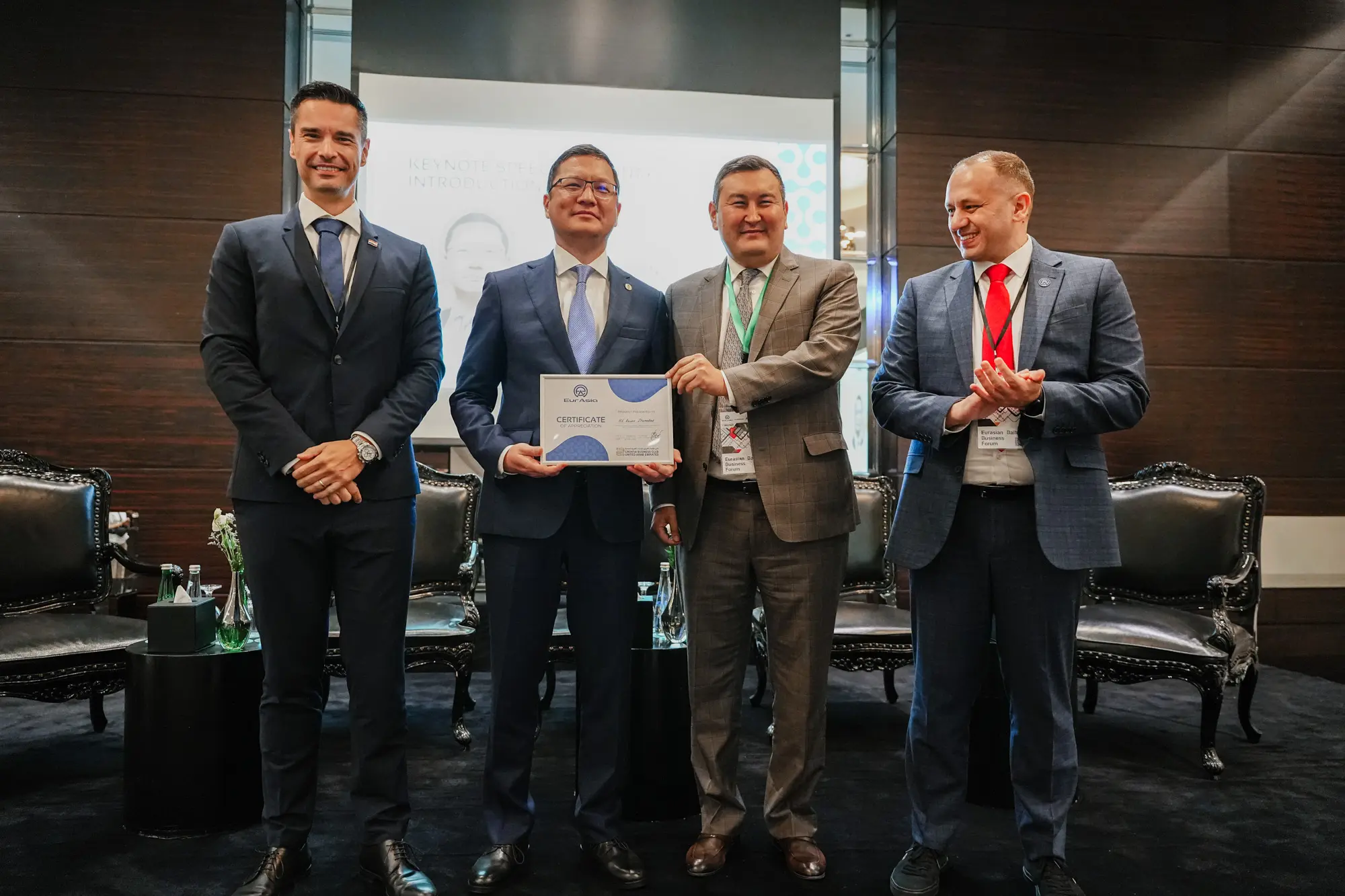 This discussion was moderated by Irina Ryzhakova, CEO of Make Fortune Business Solutions. The panel included Victor Haruta, Former Ambassador and Vice Chairman of EurAsia Gulf, Shahrukh Rakhimov, Director General of the Ministry of Investment, Industry and Trade of Uzbekistan (UAE office), Alibek Almabekov, Chairman of the Qazaqstan Business Council, and Dr. Usama Al Malki, COO of EurAsia Gulf.